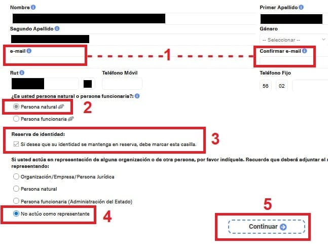 Los nombres y RUT se completarán automáticamente (con los datos de la Clave Única). Complete los demás datos obligatorios: