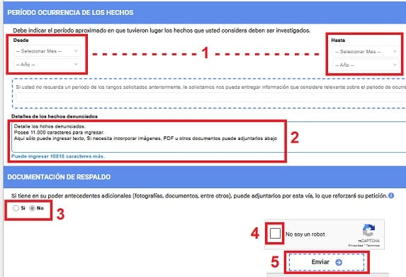 - Detalles de los hechos denunciados: Escriba detalladamente los hechos denunciados. Posee un máximo de 11.000 caracteres y sólo puede ingresar texto.