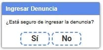 6. Aparecerá un mensaje de confirmación de ingreso de la denuncia. Haga click en Sí para enviarla: