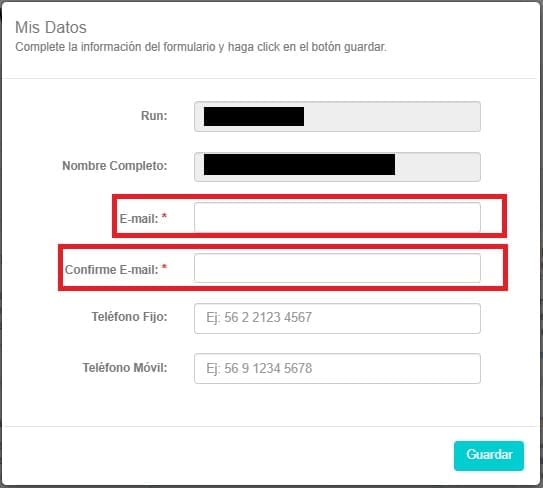 PASO 3. Al ingresar por primera vez, se te pedirá completar tus datos personales. Actualmente el único dato que se exige como obligatorio es un correo electrónico personal, el que deberás escribir 2 veces: