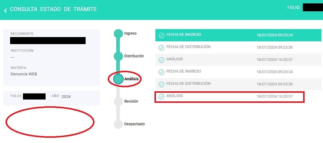 Si la denuncia lleva demasiado tiempo en ANÁLISIS, puede pedirse información vía Ley de Transparencia. Esto suele funcionar como una medida que lograr apurar la resolución de ciertas denuncias.