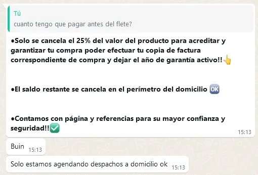 Si la persona deposita dinero, el falso vendedor finge que se está haciendo el flete y mantiene informado al cliente. Antes de que supuestamente llegue el producto, el falso vendedor llama a la persona y le pide que deposite el dinero restante. Le inventa alguna escusa de que el camión no puede llegar al domicilio por cualquier motivo. Presiona para que la persona deposite el dinero, antes de que pueda ver el producto (producto que no existe). Si la persona deposita el dinero, el falso vendedor la borra de todas las redes sociales, no contesta llamadas y desaparece.