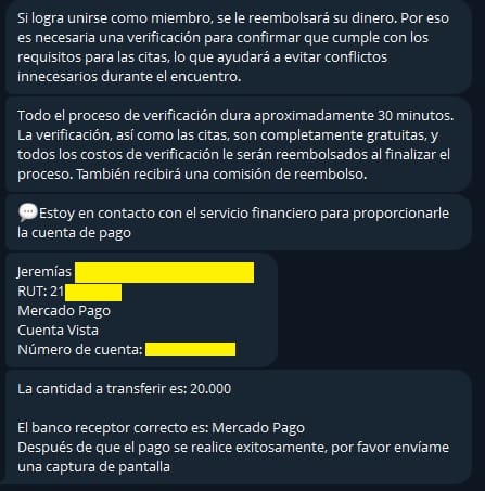 Primero se nos exige pagar una suma de dinero mediante transferencia bancaria a una persona residente en Chile.